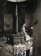 When the Chakraphat Phiman Hall was first built it was entirely roofed with palm leaves; later these were replaced with ceramic tiles, then with glazed tiles during the reign of King Rama V. There is a tradition that no uncrowned kings are allowed to sleep within this hall. However once they were crowned they were required to sleep there, if only for a few nights, literally on the bed of their forefathers.[35][40] In 1910, prior to his coronation, King Rama VI had a well-concealed modern toilet installed near the bedchamber.[41] The king spent many nights here near the end of his life and died here in 1925. King Prajadhipok (Rama VII) and King Rama IX only spent a few nights here after their respective coronations in accordance with tradition.[35]