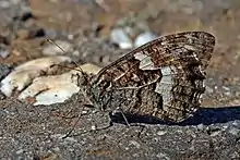 The grayling or rock grayling (Hipparchia semele) is a species in the brush-footed butterfly family Nymphalidae.[1] Although found all over Europe, the grayling mostly inhabits coastal areas, with inland populations declining significantly in recent years.[1][2] The grayling lives in dry and warm habitats with easy access to the sun, which helps them with body temperature regulation.[1][2]