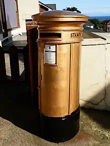 The team won 65 medals in total: 29 gold, 17 silver and 19 bronze; after medal reallocation in men's high jump: 29 gold, 18 silver, and 18 bronze.[6] For each gold medallist, a post box was painted gold by Royal Mail in recognition of the achievement, usually in the competitor's home town.[7] A first class stamp depicting each gold medal-winning individual or team was also produced.[7][8]