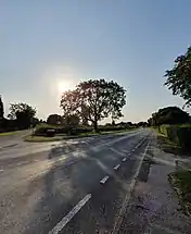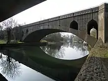 At Alconbury, the Great North Road joined the Old North Road, an older route which followed the Roman Ermine Street. Here a milestone records mileages to London via both routes: 65 by the Old North Road and 68 by the Great North Road.[8] From Alconbury the Great North Road follows the line of Ermine Street north, through Stilton, and crossed the River Nene at Wansford. Ermine Street crossed the River Welland about a mile to the west of what is now the town of Stamford. The Great North Road passed through the centre of Stamford, with two very sharp bends, re-joined the alignment of Ermine Street just before Great Casterton and continued as far as Colsterworth (at the A151 junction). Inns on this section included the George at Stamford and the Bell Inn at Stilton, the original sellers of Stilton cheese.