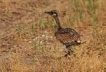 The specific epithet tarda comes from the Latin word tardus for "slow" and "deliberate",[11] which is apt to describe the typical walking style of the species.[12] The Latin phrase avis tarda "slow bird" is where the word bustard comes from borrowing Old French bistarda.[13][14]