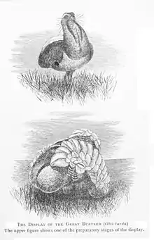 The great bustard breeds in March, and a single male may mate with up to five females. Before mating, the males moult into their breeding plumage around January. Males establish dominance in their groups during winter, clashing violently by ramming into and hitting each other with their bills.[3] Like other bustards, the male great bustard displays and competes for the attention of females on what is known as a lek. In this species, the male has a flamboyant display beginning with the strutting male puffing up his throat to the size of a football. He then tilts forwards and pulls his head in so that the long whiskery chin feathers point upwards and the head is no longer visible. He next cocks his tail flat along his back, exposing the normally hidden bright white plumage then he lowers his wings, with the primary flight feathers folded but with the white secondaries fanning out.[39] The displaying males, who may walk around for several minutes at a time with feathers flared and head buried waiting for hens to arrive, have been described as a "foam-bath" because of their appearance.[18] All breeding great bustards also moult again from June to September.