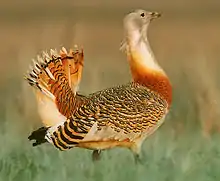 The great bustard (Otis tarda) is a bird in the bustard family, and it is the only living member of the genus Otis.[2] It breeds in open grasslands and farmland from northern Morocco, South and Central Europe, to temperate Central and East Asia. European populations are mainly resident, but Asian populations migrate farther south in winter. It has been listed as a Vulnerable species on the IUCN Red List since 1996.[1]