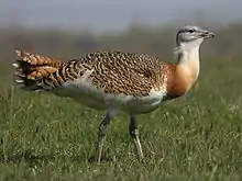 An adult male is brown above, barred with blackish colouration, and white below, with a long grey neck and head. His breast and lower neck sides are chestnut and there is a golden wash to the back and the extent of these bright colours tending to increase as the male ages. In the breeding season, the male has long white neck bristles, which measure up to 12–15 cm (4.7–5.9 in) in length, continually growing from the third to the sixth year of life.[3] In flight, the long wings are predominantly white with brown showing along the edges of the lower primary and secondary feathers and a dark brown streak along the upper-edge of the wing. The breast and neck of the female are buff, with brown and pale colouration over the rest of the plumage rendering it well camouflaged in open habitats. Immature birds resemble the female. The eastern subspecies (O. t. dybowskii) is more extensively grey in colour in both sexes, with more extensive barring on the back.[3] The great bustard has long legs, a long neck and a heavy, barrel-chested body. It is fairly typical of the family in its overall shape and habitat preferences. Three other bustard species overlap in range with this species: the Macqueen's (Chlamydotis macqueenii), houbara (Chlamydotis undulata) and little bustards (Tetrax tetrax). However, none of these attains the plumage coloration nor approach the body sizes of this species. Thus, the great bustard is essentially unmistakable.