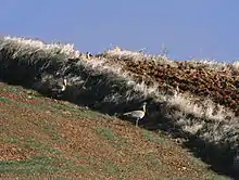 In 2004, a project overseeing the reintroduction to Salisbury Plain in Wiltshire using eggs taken from Saratov in Russia was undertaken by The Great Bustard Group,[64] a UK Registered Charity that aims to establish a self-sustaining population of great bustards in the UK. The reintroduced birds have laid eggs and raised chicks in Britain in 2009 and 2010. Although the great bustard was once native to Britain, great bustards are considered an alien species under English law.[65] The reintroduction of the great bustard to the UK by the Great Bustard Group is being carried out in parallel with researchers from the University of Bath who are providing insight into the habitat of native great bustard populations in Russia and Hungary. On January 19, 2011, it was announced that the Great Bustard Project had been awarded EU LIFE+ funding, reportedly to the tune of £1.8 million.[66] By 2020 the population in Wiltshire exceeded 100 birds.[67] In Hungary, where the species is the national bird, great bustards are actively protected. The Hungarian authorities are seeking to preserve the long-term future of the population by active protection measures; the area affected by the special ecological treatment had grown to 15 km2 (5.8 sq mi) by the summer of 2006.