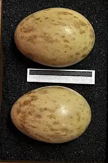 One to three olive or tan coloured, glossy eggs (two eggs being the average) are laid by the female in May or June. The nests, which are shallow scrapes made by the female on dry, soft slopes and plains, are usually situated close to the prior lek location. Nests are situated in sparse clusters, with a study in Inner Mongolia finding nests at a minimal 9 m (30 ft) apart from each other. In the same study, nests were placed at mid-elevation on a hill, at about 190 to 230 m (620 to 750 ft). Nesting sites are typically in dense grassy vegetation about 15 to 35 cm (5.9 to 13.8 in), likely for protection against predation, with extensive exposure to sunlight.[40] Eggs weigh about 150 g (5.3 oz) and are on average 79.4 mm (3.13 in) tall by 56.8 mm (2.24 in) wide. The female incubates the eggs alone for 21 to 28 days. The chicks almost immediately leave the nest after they hatch, although they do not move very far from their mother until they are at least 1 year old. Young great bustards begin developing their adult plumage at about 2 months, and begin to develop flying skills at the same time. They practice by stretching, running, flapping, and making small hops and jumps to get airborne. By three months they are able to fly reasonable distances. If threatened, the young stand still, using their downy plumage, mainly sepia in colour with paler buffy streaks, as camouflage. Juveniles are independent by their first winter, but normally stay with their mother until the next breeding season. Males usually start to mate from 5 to 6 years of age, although may engage in breeding display behaviour at a younger age. Females usually first breed at 2 to 3 years old.[3][39]