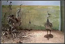 Although little detailed information has been obtained of predators, over 80% of great bustards die in the first year of life and many are victims of predation. Chicks are subject to predation by the fact that they are ground-dwelling birds which are reluctant to fly. Predators of eggs and hatchlings include raptors, corvids, hedgehogs, foxes, weasels, badgers (Meles ssp.), martens (Martes ssp.), rats (Rattus ssp.) and wild boars (Sus scrofa). The most serious natural predators of nests are perhaps red foxes and hooded crows (Corvus cornix).[49] Chicks grow very quickly, by 6 months being nearly two-thirds of their adult size, and are predated by foxes, lynxes, wolves (Canis lupus), dogs, jackals and eagles.[50] Predation on adult male great bustards has been reportedly committed by white-tailed eagles (Haliaeetus albicilla) while golden eagles (Aquila chrysaetos) are potential predators and eastern imperial eagles (Aquila heliaca) have been known to prey on great bustards (but not likely to include adult males).[51][52][53] Great bustards of unspecified age and sex have been found amongst Eurasian eagle-owl (Bubo bubo) prey remains in Bulgaria.[54] A possible act of predation on a great bustard was observed to be committed by a much smaller raptor, the western marsh harrier (Circus aeruginosus), though it was likely that this bustard was "weak or injured" if it was taken alive.[55] The bold, conspicuous behaviour of the breeding adult male bustard may attract the same large mammalian predators that predate chicks, such as wolves and lynx, while the more inconspicuous female may sometimes be attacked by various predators. However, predation is generally fairly rare for adults due to their size, nimbleness and safety in numbers due to their social behaviour.[3][21][56][57]