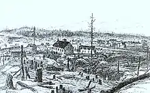 Local smelting of the ore releases this sulphur into the atmosphere where it combines with water vapour to form sulphuric acid, contributing to acid rain. As a result, Sudbury has had a widespread reputation as a wasteland.[36] In parts of the city, vegetation was devastated by acid rain and logging to provide fuel for early smelting techniques. To a lesser extent, the area's ecology was also impacted by lumber camps in the area providing wood for the reconstruction of Chicago after the Great Chicago Fire of 1871. While other logging areas in Northeastern Ontario were also involved in that effort, the emergence of mining-related processes in the following decade made it significantly harder for new trees to grow to full maturity in the Sudbury area than elsewhere.[20]