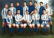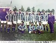 Greece had to wait 13 years for their next (unofficial) appearance when they participated in the Inter-Allied Games in Paris in 1919, following the end of World War I, and once again it was a disaster as the team conceded twenty goals without reply in their first two games, although this time with a silver lining since Greece managed to beat Romania in their third and final match with a dramatic 3–2 win.[5] In the following year, Greece participated in the 1920 Summer Games of Antwerp, being knocked out in the first round by Sweden with yet another heavy defeat (9–0). This match is recognized as their first official match by FIFA.[6] Notable figures during these years was Giorgos Kalafatis, player and later manager of the team, and Giannis Andrianopoulos.