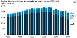 In May 2010, Montgomery County, Maryland, passed the nation's first county-level carbon tax.[109] The legislation required payments of $5 per ton of CO2 emitted from any stationary source emitting more than a million tons of carbon dioxide per year.[110] The only source of emissions fitting the criteria is an 850 megawatt coal-fired power plant then owned by Mirant Corporation. The tax was expected to raise between $10 million and $15 million for the county, which faced a nearly $1 billion budget gap.[111] The law directed half of tax revenues toward low interest loans for county residents to invest in residential energy efficiency.[110] The county's energy supplier buys its energy at auction, requiring the plant owner to sell its energy at market value, preventing any increase in energy costs. In June 2010, Mirant sued the county to stop the tax.[112] In June 2011 the Federal Court of Appeals ruled that the tax was a fee imposed "for regulatory or punitive purposes" rather than a tax, and therefore could be challenged in court.[113] The County Council repealed the fee in July 2012.[114]