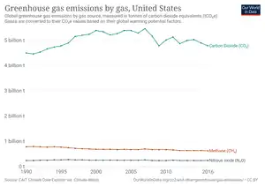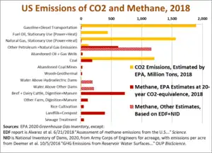 After carbon dioxide, the next most abundant compound is methane, though there have been methodological differences in how to measure its effects. According to a 2016 study, US methane emissions were underestimated by the EPA for at least a decade, by some 30 to 50 percent.[25] Currently, the US government is working to reduce methane emissions in the agriculture, mining, landfill, and petroleum industries.[26]