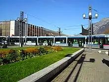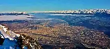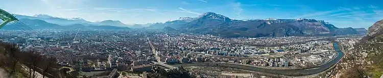 The population of the commune of Grenoble was 158,198 as of 2019, while the population of the Grenoble metropolitan area (French: aire d'attraction de Grenoble or agglomération grenobloise) was 714,799 which makes it the largest metropolis in the Alps, ahead of Innsbruck and Bolzano.[3] A significant European scientific centre,[6][7] the city advertises itself as the "Capital of the Alps", due to its size and its proximity to the mountains. The many suburban communes that make up the rest of the metropolitan area include four with populations exceeding 20,000: Saint-Martin-d'Hères, Échirolles, Fontaine and Voiron.[8][9]