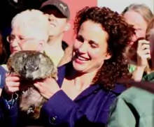 Tobolowsky was hired after delivering an "overwhelmingly obnoxious" portrayal during his audition.[41] Michael Shannon, who portrays prospective groom Fred, made his on-screen acting debut in the film. He spent much of the shoot in the background of the diner scene as they wanted all the actors in their places even if the camera was not focused on them.[42] A live groundhog, given the name Scooter, was used to portray Punxsutawney Phil. Punxsutawney officials, upset that their town was not used for filming, refused to allow the real Punxsutawney Phil to appear in the film.[16][43] The groundhog itself was not specially bred for use on film and was trapped in the wild near Illinois a few weeks before filming.[27]
