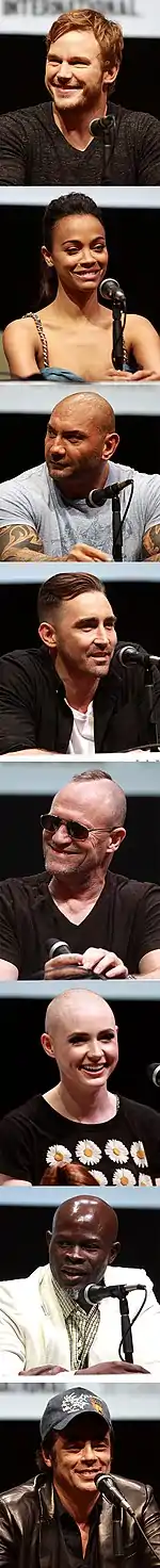 In early April 2013, Zoe Saldaña entered into negotiations to star as Gamora in the film, and it was confirmed she had been cast later that month.[71][128] Amanda Seyfried had been offered the role, but declined due to the excessive hours of make-up required for the role, and her uncertainty over the film's commercial viability.[129] Also in April, Michael Rooker joined the film's cast as Yondu Udonta,[52] and it was announced that Ophelia Lovibond had been cast in a supporting role.[71] By this point in time, Lee Pace was in final negotiations to play the villain of the film.[130] In May, Marvel offered John C. Reilly the role of Rhomann Dey.[131] At the same time, it was disclosed that filmmakers were looking at actors including Hugh Laurie, Alan Rickman, and Ken Watanabe, for another role, and that Christopher Markus and Stephen McFeely were providing finishing touches to the script.[131] A few days later, Glenn Close was cast as the head of the Nova Corps in the film,[62] followed shortly by the casting of Karen Gillan as the film's lead female villain.[132] By June 2013, Benicio del Toro was cast in the film, as part of a multi-film deal with Marvel Studios.[65] Later in the month, it was confirmed that Reilly had been cast as Rhomann Dey.[60]