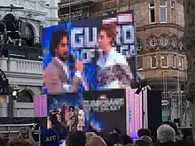 At Disney's D23 Expo in August 2013, Feige presented footage first revealed at the San Diego Comic-Con in July 2013.[175] The first trailer for the film debuted on Jimmy Kimmel Live! on February 18, 2014, with a special introduction by Chris Pratt.[10] The Los Angeles Times said the trailer delivered "some spirited alien action, with exploding spaceships and muscled bad guys, not to mention a few purely comedic moments," while spotlighting "a number of the offbeat characters."[176] Total Film noted the similarity of the trailer's opening clip to the 1981 film, Raiders of the Lost Ark, which Gunn stated was a big influence for Guardians,[177] and made note of the "edgy" humor used throughout.[178] Total Film also noted the similarity of the trailer to the one debuted at Comic-Con and D23, with a few new shots featuring Nebula and the Collector.[179][180] Social media response to the trailer was strong, with 88,000 mentions across Twitter, Facebook and various blogs in a 12-hour period. Those numbers were comparable to trailers for other superhero films like Man of Steel and The Amazing Spider-Man 2, and noteworthy for the late night-time period in which it premiered.[181] The trailer received 22.8 million views in the 24 hours after it debuted.[182] After the debut of the trailer, Blue Swede's version of "Hooked on a Feeling", which was prominently used throughout the trailer, went up 700% in sales the following day.[183] The line from Serafinowicz's character, "What a bunch of a-holes", was only intended to be featured in the trailers, but due to its positive reception, was included in the final cut of the film.[80] Gunn noted that a different teaser was almost released "that was very cheesy [and] sold the movie as something different than what it was", as it tested better than the version that was ultimately released. Gunn credited the marketing teams at Marvel and Disney for having faith in the latter version, despite how it tested, over choosing the version that would have mis-marketed the film.[184]