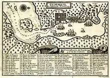 On 20 April 1687, Guayaquil was attacked and looted by English and French pirates under the command of George d'Hout (English) and Picard and Groniet (French).[9] Of more than 260 pirates, 35 were killed and 46 were wounded; 75 defenders of the city died and more than 100 were wounded.