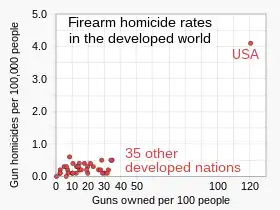 In 2018 it was estimated that U.S. civilians own 393 million firearms,[15] and that 40% to 42% of the households in the country have at least one gun. However, record gun sales followed in the following years.[16][17][18] The U.S. has by far the highest estimated number of guns per capita in the world, at 120.5 guns for every 100 people.[19]