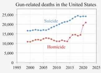 Gun violence is a term of political, economic and sociological interest referring to the tens of thousands of annual firearms-related deaths and injuries occurring in the United States.[2] In 2022, up to 100 daily fatalities and hundreds of daily injuries were attributable to American gun violence.[3] In 2018, the most recent year for which data are available, the Centers for Disease Control and Prevention's (CDC) National Center for Health Statistics reported 38,390 deaths by firearm, of which 24,432 were suicides.[4][5] The national rate of firearm deaths rose from 10.3 people for every 100,000 in 1999 to 11.9 people per 100,000 in 2018, equating to over 109 daily deaths (or about 14,542 annual homicides).[6][7][8][9] In 2010, there were 19,392 firearm-related suicides, and 11,078 firearm-related homicides in the U.S.[10] In 2010, 358 murders were reported involving a rifle while 6,009 were reported involving a handgun; another 1,939 were reported with an unspecified type of firearm.[11] In 2011, a total of 478,400 fatal and nonfatal violent crimes were committed with a firearm.[12]