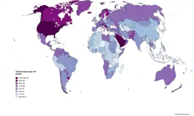 Gun ownership figures are generally estimated via polling, by such organizations as the General Social Survey (GSS), Harris Interactive, and Gallup. There are significant disparities in the results across polls by different organizations, calling into question their reliability.[21] In Gallup's 1972 survey, 43% reported having a gun in their home, while GSS's 1973 survey resulted in 49% reporting a gun in the home; in 1993, Gallup's poll results were 51%, while GSS's 1994 poll showed 43%.[22] In 2012, Gallup's survey showed 47% of Americans reporting having a gun in their home,[23] while the GSS in 2012 reports 34%.[22] In 2018 it was estimated that U.S. civilians own 393 million firearms,[24] and that 40% to 42% of the households in the country have at least one gun. However, record gun sales followed in the following years.[25][26][27]