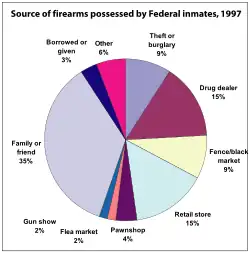 Gun rights advocates argue that policy aimed at the supply side of the firearms market is based on limited research.[2] One consideration is that 60–70% of firearms sales in the U.S. are transacted through federally licensed firearm dealers, with the remainder taking place in the "secondary market", in which previously owned firearms are transferred by non-dealers.[28][235][236][237] Access to secondary markets is generally less convenient to purchasers, and involves such risks as the possibility of the gun having been used previously in a crime.[238] Unlicensed private sellers were permitted by law to sell privately owned guns at gun shows or at private locations in 24 states as of 1998.[239] Regulations that limit the number of handgun sales in the primary, regulated market to one handgun a month per customer have been shown to be effective at reducing illegal gun trafficking by reducing the supply into the secondary market.[240] Taxes on firearm purchases are another means for government to influence the primary market.[241]