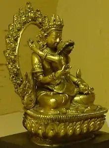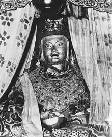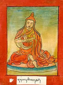 In modern Tibetan Buddhism, Padmasambhava is considered to be a Buddha that was foretold by Buddha Shakyamuni.[2] According to traditional hagiographies, his students include the great female masters Yeshe Tsogyal and Mandarava.[5] The contemporary Nyingma school considers Padmasambhava to be a founding figure.[12][4] The Nyingma school also traditionally holds that its Dzogchen lineage has its origins in Garab Dorje through a direct transmission to Padmasambhava.[13]