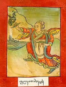 Cradled in his left arm he holds the three-pointed khatvanga (trident) symbolizing the Princess consort Mandarava, one of his two main consorts.[40][42] who arouses the wisdom of bliss and emptiness, concealed as the three-pointed khatvanga.[41] Other sources say that the khatvanga represents the Lady Yeshe Tsogyal, his primary consort and main disciple.[43] Its three points represent the essence, nature and compassionate energy (ngowo, rangshyin and tukjé).[41][42] Below these three prongs are three severed heads, dry, fresh and rotten, symbolizing the dharmakaya, sambhogakaya and nirmanakaya.[41][42] Nine iron rings adorning the prongs represent the nine yanas.[41][42] Five-coloured strips of silk symbolize the five wisdoms[41] The khatvanga is also adorned with locks of hair from dead and living mamos and dakinis, as a sign that the Master subjugated them all when he practised austerities in the Eight Great Charnel Grounds.[41][42]