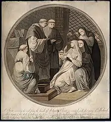 It is commonly portrayed that Abelard forced Heloise into the convent due to jealousy. Yet, as her husband was entering the monastery, she had few other options at the time,[26] beyond perhaps returning to the care of her betrayer Fulbert, leaving Paris again to stay with Abelard's family in rural Brittany outside Nantes, or divorcing and remarrying (most likely to a non-intellectual, as canon scholars were increasingly expected to be celibate). Entering religious orders was a common career shift or retirement option in twelfth-century France.[27] Her appointment as a nun, then prioress, and then abbess was her only opportunity for an academic career as a woman in twelfth-century France, her only hope to maintain cultural influence, and her only opportunity to stay in touch with or benefit Abelard. Examined in a societal context, her decision to follow Abelard into religion upon his direction, despite an initial lack of vocation, is less shocking.