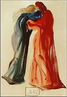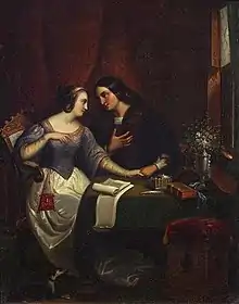 Héloïse wrote critically of marriage, comparing it to contractual prostitution, and describing it as different from "pure love" and devotional friendship such as that she shared with Peter Abelard.[40] In her first letter, she writes that she "preferred love to wedlock, freedom to a bond."[41] She also states, "Assuredly, whomsoever this concupiscence leads into marriage deserves payment rather than affection; for it is evident that she goes after his wealth and not the man, and is willing to prostitute herself, if she can, to a richer."[41] Peter Abelard himself reproduces her arguments (citing Heloise) in Historia Calamitatum.[40] She also writes critically of childbearing and child care and the near impossibility of coexistent scholarship and parenthood. Heloise apparently preferred what she perceived as the honesty of sex work to what she perceived as the hypocrisy of marriage: "If the name of wife seems holier and more impressive, to my ears the name of mistress always sounded sweeter or, if you are not ashamed of it, the name of concubine or whore...God is my witness, if Augustus, who ruled over the whole earth, should have thought me worthy of the honor of marriage and made me ruler of all the world forever, it would have seemed sweeter and more honorable to me to be called your mistress than his empress."[37] (The Latin word she chose now rendered as "whore", scortum [from "scrotum"], is curiously in medieval usage a term for male prostitute or "rent boy".)[40][42]