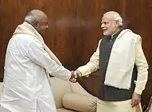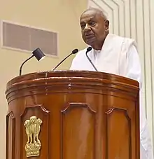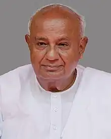 Haradanahalli Doddegowda Deve Gowda (pronunciation; born 18 May 1933)[3] is an Indian politician who served as the 11th prime minister of India from 1 June 1996 to 21 April 1997.[4][5] He was previously the 14th Chief Minister of Karnataka from 1994 to 1996. He presently is a Member of Parliament in the Rajya Sabha representing Karnataka. He is the national president of the Janata Dal (Secular) party.[6] Born in a farming family, he joined the Indian National Congress party in 1953, and remained a member until 1962. He was imprisoned during the Emergency. He became President of the state unit of Janata Dal in 1994, and was considered to be a driving force in the party's victory in Karnataka. He served as the 8th Chief Minister of Karnataka from 1994 to 1996. In the 1996 general elections, no party won enough seats to form a government. When the United Front, a coalition of regional parties, formed the central government with the support of the Congress, Deve Gowda was unexpectedly chosen to head the government and was elected Prime Minister. During his tenure as prime minister, he also served as Home Minister for some time. His prime ministerial tenure lasted for less than a year. After his prime ministerial tenure, he was elected to the 12th (1998), 14th (2004), 15th, and 16th Lok Sabha, as Member of Parliament for the Hassan Lok Sabha constituency. He lost Lok Sabha elections in 2019 from Tumkuru but has been elected to Rajya Sabha since.[7]