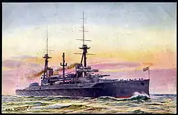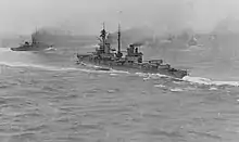 At 18:24, Agincourt opened fire on a German battlecruiser with her main guns. Shortly afterwards her six-inch guns followed suit as German destroyers made torpedo attacks on the British battleships to cover the turn to the south of the High Seas Fleet.[47] Agincourt successfully evaded two torpedoes, although another struck Marlborough.[48] Visibility cleared around 19:15, and she engaged a Kaiser-class battleship without result before it was lost in the smoke and haze.[49] Around 20:00, Marlborough was forced to reduce speed because of the strain on her bulkheads from her torpedo damage and her division mates conformed to her speed.[50] In the reduced visibility the division lost sight of the Grand Fleet during the night, passing the badly damaged battlecruiser SMS Seydlitz without opening fire.[51] Dawn found them with only the detritus from the previous day's battle in sight and the division arrived back at Scapa Flow on 2 June.[52] Agincourt fired 144 twelve-inch shells and 111 six-inch shells during the battle, although she is not known to have hit anything.[43]