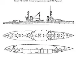 Agincourt had an overall length of 671 feet 6 inches (204.7 m), a beam of 89 feet (27 m), and a draught of 29 feet 10 inches (9.1 m) at deep load. She displaced 27,850 long tons (28,297 t) at load and 30,860 long tons (31,355 t) at deep load. The ship had a metacentric height of 4.9 feet (1.5 m) at deep load.[16] She had a large turning circle, but manoeuvred well despite her great length. She was considered to be a good gun platform.[17]