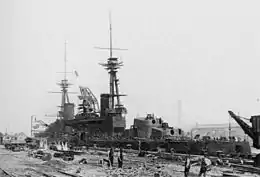 Agincourt was later transferred to the 2nd Battle Squadron[43] and was present at the surrender of the High Seas Fleet on 21 November 1918.[54] She was placed in reserve at Rosyth in March 1919. After unsuccessful attempts to sell her to the Brazilian Government, she was listed for disposal in April 1921, but was used for experimental purposes later that year.[25] The Royal Navy then planned to convert her into a mobile naval base and she was recommissioned on 21 November[55] in preparation for the conversion, which would have included the removal of five of her seven turrets with their barbettes converted into storage and workshops; Nos. 2 and 5 turrets would have been retained.[56] The conversion was cancelled on 23 February 1922 after the Washington Naval Treaty was signed that limited the battleship tonnage allowed to the RN and she was paid off on 7 April and listed again for disposal.[55]
