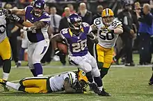 At the other extreme are "power backs": bigger, stronger players who can break through tackles using brute strength and raw power. They are usually (but not always) slower runners compared to other backs, and typically run straight ahead (or "North-and-South" in football terminology) rather than dodging to the outside edges of the playing field (i.e. running "East-and-West") like shorter, quicker, lighter backs will often do. Power backs from previous generations such as Jim Brown and Larry Csonka were often classified as fullbacks, but halfbacks such as Jerome Bettis and Steven Jackson also exemplify the power back position. More recent examples include Marshawn Lynch, Frank Gore of the New York Jets, Leonard Fournette of the Tampa Bay Buccaneers,[11] Nick Chubb of the Cleveland Browns and Derrick Henry of the Tennessee Titans.[12] For many years the “power” running back was the central component of an offense. In that time period formations and rhythm favored this type of player. This sort of offensive scheme is now a rarity, as “power backs” take on supporting roles behind faster and more versatile running backs.[10]