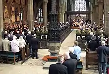 Former regimental colours of the 'Duke's' are laid up in the Halifax Minster. These include the stand used by the 33rd Regiment between 1761 and 1771, which is one of the oldest in existence in England, plus those carried by the regiment during the Battle of Waterloo and the Crimea.[24] The 1981 stand of colours, was taken out of service in 2002. They were marched through the town from the town hall to the minster, which at that time was still a parish church, accompanied by two escorts of 40 troops, the Regimental Drums and the Heavy Cavalry and Cambrai Band on Sunday 31 March 2007. The troops were then inspected by the Lord Lieutenant of West Yorkshire, Dame Ingrid Roscoe DCVO DStJ FSA and the Mayor of Halifax Cllr Colin Stout making a total of eight stands of colours within the Regimental Chapel. The regiment was presented with the "Freedom of Halifax" on 18 June 1945.