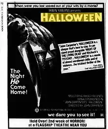 The following month, Voice lead critic Andrew Sarris wrote a follow-up feature on cult films, citing Allen's appraisal of Halloween and writing in the lead sentence that the film "bids fair to become the cult discovery of 1978. Audiences have been heard screaming at its horrifying climaxes".[94] Roger Ebert gave the film similar praise in his 1979 review in the Chicago Sun-Times, referring to it as "a visceral experience—we aren't seeing the movie, we're having it happen to us. It's frightening. Maybe you don't like movies that are really scary: Then don't see this one."[95] Ebert also selected it as one of his top 10 films of 1978.[96] Once-dismissive critics became impressed by Carpenter's choice of camera angles and simple music, and surprised by the lack of blood and graphic violence.[70]