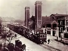 Temporary railway lines connecting the stations were built partly on squares and streets. When it was decided to build a common station for all lines, a competition was arranged in 1900. Built between 1902 and 1906, the Hamburg Hauptbahnhof was designed by the architects Heinrich Reinhardt and Georg Süßenguth, modeled after the Galerie des machines of the World's Fair of 1889 in Paris, by Louis Béroud.[7] The German emperor William II declared the first draft to be "simply horrible", but the second draft was eventually constructed. The emperor personally changed the Art Nouveau style elements to Neo-Renaissance, giving the station a fortification-like character.[8] The station was opened for visitors on 4 December 1906, the first train arrived the next day, and scheduled trains started on 6 December 1906.[7]