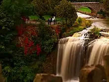 The Hamilton Conservation Authority owns, leases or manages about 4,500 hectares (11,100 acres) of land with the city operating 1,077 hectares (2,661 acres) of parkland at 310 locations.[49][50] Many of the parks are along the Niagara Escarpment, which runs from Tobermory at the tip of the Bruce Peninsula in the north, to Queenston at the Niagara River in the south, and provides views of the cities and towns at Lake Ontario's western end. The hiking path Bruce Trail runs the length of the escarpment.[51] Hamilton is home to more than 100 waterfalls and cascades, most of which are on or near the Bruce Trail as it winds through the Niagara Escarpment.[52] Visitors can often be seen swimming in the waterfalls during the summertime, although it is strongly recommended to stay away from the water: much of the watershed of the Chedoke and Red Hill creeks originates in storm sewers running beneath neighbourhoods atop the Niagara escarpment, and water quality in many of Hamilton's waterfalls is seriously degraded. High e. coli counts are regularly observed through testing by McMaster University near many of Hamilton's waterfalls, sometimes exceeding the provincial limits for recreational water use by as much as 400 times. The storm sewers in upstream neighbourhoods carry polluted runoff from streets and parking lots, as well as occasional raw sewage from sanitary lines that were improperly connected to the storm sewers instead of the separate sanitary sewer system. Notably, in March 2020, it was revealed that as much as 24 billion litres of untreated wastewater has been leaking into the Chedoke creek and Cootes' Paradise areas since at least 2014 due to insufficiencies in the city's sewerage and storm water management systems.[53]
