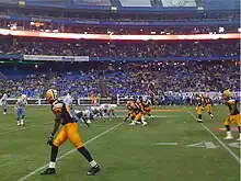 In 2001, Hamilton finished 11–7, and lost to Winnipeg in the playoffs for a second straight season, 28–13.[23] In 2002, Hamilton finished 7–11 and missed the playoffs.[24] The team reached their lowest ebb in 2003, having not only a franchise-worst season, but the worst record in CFL history, finishing 1–17 (and losing the most games in the CFL's 18-game schedule), with only a 27–24 overtime victory in week 14 keeping the declawed Tiger-Cats from having an imperfect season.[25]