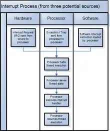 In digital computers, an interrupt (sometimes referred to as a trap)[1] is a request for the processor to interrupt currently executing code (when permitted), so that the event can be processed in a timely manner. If the request is accepted, the processor will suspend its current activities, save its state, and execute a function called an interrupt handler (or an interrupt service routine, ISR) to deal with the event. This interruption is often temporary, allowing the software to resume[lower-alpha 1] normal activities after the interrupt handler finishes, although the interrupt could instead indicate a fatal error.[2]