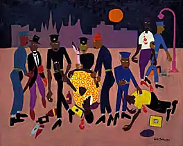 Several authors and artists have depicted the event in their respective works. African-American novelist James Baldwin wrote of the riot, which occurred on the same day as his father's funeral and his 19th birthday, in Notes of a Native Son.[27] "It seemed to me", Baldwin wrote, "that God himself had devised, to mark my father's end, the most sustained and brutally dissonant of codas".[28] In a commentary piece for The New York Times, Langston Hughes called the essay "superb", and particularly quoted Baldwin's observation that "to smash something is the ghetto's chronic need".[29] Hughes wrote "The Ballad of Margie Polite", a poem on the riot published in New York Amsterdam News. According to Laurie Leach in her 2007 article published in Studies in the Literary Imagination, the poem "seems to honor rather than censure Polite for her role as a catalyst" .[30] Ralph Ellison drew upon his experiences covering the riot for the New York Post as inspiration for the "theatrical climax" of Invisible Man, winner of the 1953 National Book Award.[31][32]