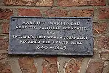 She next moved downriver to Tynemouth where she regained her health.[42] She stayed at Mrs Halliday's boarding-house, 57 Front Street, for nearly five years from 16 March 1840. The establishment is still open as a guest house today, now named the "Martineau Guest House" in her honor.[43]