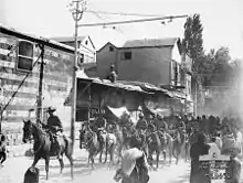 In September 1918, Chauvel was able to effect a secret redeployment of two of his mounted divisions.[82] Allenby launched a surprise attack on the enemy and won the Battle of Megiddo. He then followed up this victory with one of the fastest pursuits in military history – 167 km in only three days.[83] This time he succeeded in destroying the Turkish army. The Desert Mounted Corps moved across the Golan Heights and captured Damascus on 1 October. Between 19 September and 2 October, the Australian Mounted Division lost 21 killed and 71 wounded, and captured 31,335 Turkish prisoners.[84] To restore calm in the city, Chauvel ordered a show of force. Lieutenant Colonel T. E. Lawrence later lampooned this as a "triumphal entry" but it was actually a shrewd political stroke,[85] freeing Chauvel's forces to advance another 300 km to Aleppo, which was captured on 25 October. Five days later, Turkey surrendered.[86] For this victory, Chauvel was again mentioned in despatches.[87]