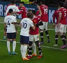 Kane scored a hat-trick against Maccabi Haifa in the UEFA Europa League play-off round on 1 October, securing qualification for the group stage.[159] On 4 October, he scored a brace in a 6–1 away win against Manchester United, which is the biggest win for Tottenham at Old Trafford and their best result against United since a home win in 1932.[160][161] He scored his 200th goal for Tottenham in his 300th appearance for the club in the 3–1 win over Ludogorets in the group stage of the Europa League.[162] Kane scored in Tottenham's 2–0 victory over rivals Arsenal making him the record highest goalscorer in the history of the North London Derby with 11 goals.[163] It was also Kane's 100th home goal for Tottenham in all competitions, and his 250th career goal for club and country.[164]