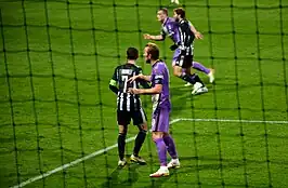 The 2021–22 season was preceded by a dispute over a desire by Kane to leave Tottenham, saying he had a gentlemen's agreement with chairman Daniel Levy that would allow him to leave in the summer.[169] The agreement was not honoured, and Levy rejected the interest expressed by Manchester City for Kane's services,[170][171] including a £127 million transfer bid.[172] Kane failed to turn up for pre-season training and did not play the first two games of the season.[173][174] He made his season bow on 22 August as a substitute against Wolverhampton Wanderers – his first appearance since returning late for pre-season.[175] Kane announced his desire to stay at Tottenham on 25 August after the move to Manchester City failed to materialise, with Kane stating: "I will be staying at Tottenham this summer and will be 100 per cent focused on helping the team achieve success."[176] The following day Kane made his first appearance in the UEFA Europa Conference League, against Paços de Ferreira. He scored twice in a 3–0 win to secure the team's progress to the group stage.[177] On 30 September, in the second match of the group stage, he scored a hat-trick in 20 minutes against Mura after coming on as a substitute to win 5–1.[178] This was the first hat-trick ever scored in the Europa Conference League,[179] and made Kane the first player to score a hat-trick in all three current major UEFA club competitions (i.e. Champions League, Europa League, and Europa Conference League).