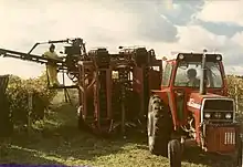 A mechanical grape harvester works by beating the vine with rubber sticks to get the vine to drop its fruit onto a conveyor belt that brings the fruit to a holding bin. As technology improves mechanical harvesters have become more sophisticated in distinguishing grape clusters from mud, leaves and other particles. Despite the improvement many harvesters still have difficulties in distinguishing between ripe, healthy grapes and unripe or rotted bunches which must then be sorted out at the winemaking facility. Another disadvantage is the potential of damaging the grape skins which can cause maceration and coloring of the juice that is undesirable in the production of white and sparkling wine. The broken skins also bring the risk of oxidation and a loss of some of the aromatic qualities in the wine.[6]
