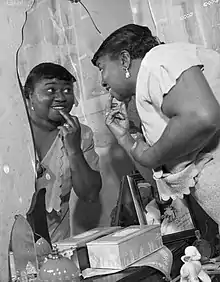 For her performance as the house servant who repeatedly scolds her owner's daughter, Scarlett O'Hara (Vivien Leigh), and scoffs at Rhett Butler (Clark Gable), McDaniel won the 1939 Academy Award for Best Supporting Actress, the first Black actor to have been nominated and win an Oscar. "I loved Mammy," McDaniel said when speaking to the white press about the character. "I think I understood her because my own grandmother worked on a plantation not unlike Tara".[26] Her role in Gone with the Wind had alarmed some whites in the South; there were complaints that in the film she had been too "familiar" with her white owners.[27] At least one writer pointed out that McDaniel's character did not significantly depart from Mammy's persona in Margaret Mitchell's novel, and that in both the film and the book, the much younger Scarlett speaks to Mammy in ways that would be deemed inappropriate for a Southern teenager of that era to speak to a much older white person, and that neither the book nor the film hints of the existence of Mammy's own children (dead or alive), her own family (dead or alive), a real name, or her desires to have anything other than a life at Tara, serving on a slave plantation.[28]: 114, n. 40, p. 115, n. 47 Moreover, while Mammy scolds the younger Scarlett, she never crosses Mrs. O'Hara, the more senior white woman in the household.[28]: 114, n. 40, p. 115, n. 47 Some critics felt that McDaniel not only accepted the roles but also in her statements to the press acquiesced to Hollywood's stereotypes, providing fuel for critics of those who were fighting for Black civil rights.[28]: 114, n. 40, p. 115, n. 47 Later, when McDaniel tried to take her "Mammy" character on a road show, Black audiences did not prove receptive.[9]: 188–190