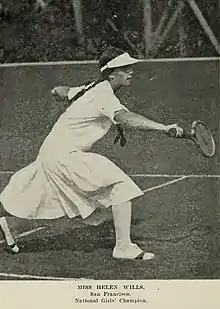 When she was eight years old, her father bought her a tennis racket and they practiced on the dirt courts next to the Alameda County Hospital as well as at Live Oak Park.[12][13] Wills' interest in tennis was kindled after watching exhibition matches by famous Californian players including May Sutton, Bill Johnston and her particular favorite, Maurice McLoughlin.[14] In August 1919, she joined the Berkeley Tennis Club as a junior member on the advice of tennis coach William "Pop" Fuller who was a friend of her father.[12][15][16] In the spring of 1920, she practiced for a few weeks with Hazel Hotchkiss Wightman, four-time winner of the U.S. Championships singles title, on strokes, footwork and tactics.[17]