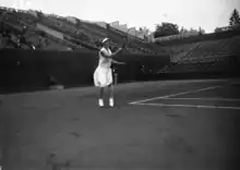 Wills entered the singles and doubles competitions at the 1924 Olympics in Paris, France.[43] The tennis tournament was played on outdoor clay courts at the Stade Olympique Yves-du-Manoir in Colombes, a northwestern suburb of Paris. It was the last Olympics where tennis was a medal event[lower-alpha 5] until the sport returned at the 1988 Olympics in Seoul, South Korea.[44] Wills won the Olympic gold medal in both the singles and doubles events. In the singles event she had a bye in the first round and won her next four matches in straight sets to reach the final which was played on July 19. Her opponent in the final was Julie Vlasto of France who was defeated in two sets.[45][46] In the doubles event she partnered veteran Hazel Wightman. The team reached the semifinal without playing, after a bye in the first round followed by two walkovers. The final against Covell and McKane was a repeat of the Wimbledon final and again the result was a two-sets victory for Wightman and Wills.[47] In early August she returned to the United States to compete in the U.S. Championships. For the first time in her career she won all three titles in the singles, doubles and mixed doubles events. For the third successive year she played against Mallory in the singles final and like in 1923 won in straight sets. The mixed doubles event was played at the Longwood Cricket Club in Brookline where she partnered Vinnie Richards to win the final against Mallory and Tilden.[48][39][49] In September she won the California State Championships against May Sutton in the final.[50] She was again ranked No. 3 in the world behind Lenglen and McKane by A. Wallis Myers.[33]