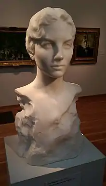 Senator James D. Phelan befriended Wills and invited her as a frequent guest to his estate, Villa Montalvo. Wills wrote poetry as a hobby, and presented two of her works, The Awakening and The Narrow Street, to a literary competition hosted by Phelan in 1926. Wills settled laurel wreaths over the heads of the winners. Phelan himself wrote a poem dedicated to Wills.[153] In 1928, Phelan commissioned Haig Patigian, sculptor and fellow member of the Bohemian Club, to create a likeness of Wills. Patigian completed a marble bust of Wills in October 1928 called Helen of California, and Phelan donated it to the M. H. de Young Memorial Museum. At his death in 1930, Phelan left Wills $20,000 ($350,359 today) in his will, "in appreciation of her winning the tennis championship for California".[154]
