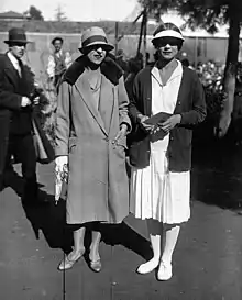 The 1928 season started in April when Wills traveled to France to compete in the French Championships.[74] She was seeded first in a field of 37 players and won the singles title with ease after a victory in the final against eighth-seeded Eileen Bennett. The American Lawn Tennis magazine commented that "Miss Wills [...] so far outclasses the top flights of women throughout the world that she has no one who really can extend here."[75] She was runner-up in the mixed doubles with Frank Hunter, losing the final to Eileen Bennett and Henri Cochet. Wills then traveled to The Hague in May to compete in an international match against the Netherlands, beating Madzy Rollin Couquerque and Kea Bouman,[76] before travelling to the All England Club in London for the sixth edition of the Wightman Cup. Wills won both her singles matches but lost to deciding doubles match with Penelope Anderson against Eileen Bennett and Phoebe Holcroft Watson.[75] At Wimbledon Wills, seeded first, won her second consecutive singles title, again after a two-sets victory in the final against Lilí de Álvarez.[77] She did not take part in the doubles event and reached the semifinal of the mixed doubles with Francis Hunter. Upon return to the United States she defended her title at the Essex Country Club Invitational against Edith Cross and won at East Hampton against Helen Jacobs.[78] At the U.S. Championships which started on August 20 Wills went through the tournament without losing a set and beat Helen Jacobs is the final. It was the first time two met in a Grand Slam final.[78][77] With Hotchkiss Wightman she won the doubles final against compatriots Edith Cross and Anna McCune Harper and subsequently she travelled to Boston where she won the mixed doubles event partnering John Hawkes. In her autobiography Fifteen-Thirty she commented that Hawkes was the best mixed doubles partner she had ever played with.[78] For the second time she was ranked No. 1 in the world by A. Wallis Myers, in front of Álvarez and Daphne Akhurst.[33]